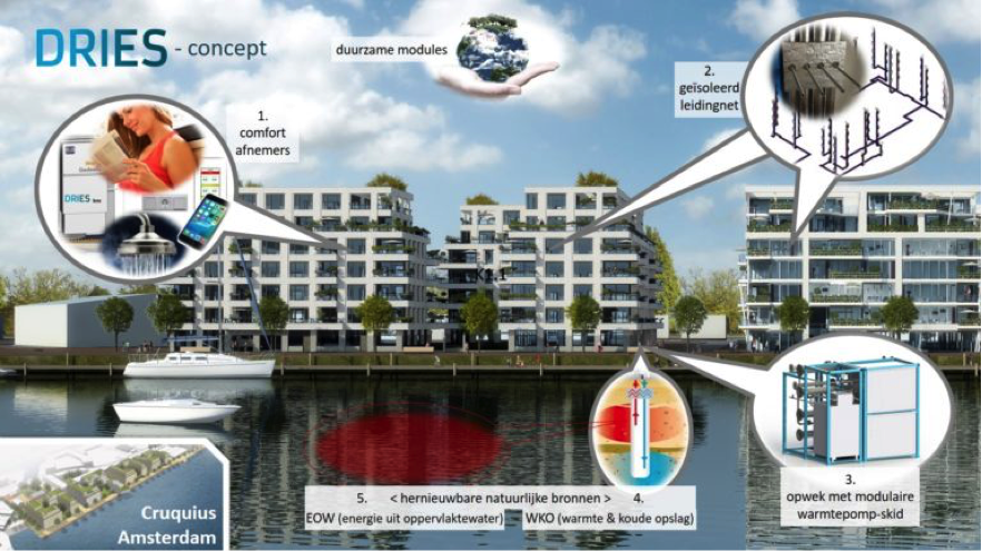 Voor het leveren van warmte en koude wordt in het DRIES-concept gebruik gemaakt van warmtepompen en bodemenergie met een Warmte-Koude-Opslag-, oftewel WKO. Het benutten van bodemenergie is een duurzame oplossing waarmee het verbruik van fossiele brandstoffen fors teruggedrongen wordt.