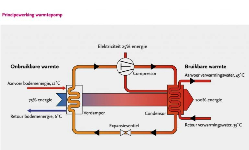 Met een warmtepomp kunnen we efficiënt warmte uit grondwater en oppervlaktewater met een lage temperatuur (onbruikbare warmte) gebruiken voor het produceren van warmte met een comfortabele temperatuur voor de vloerverwarming in uw woning (bruikbare warmte).